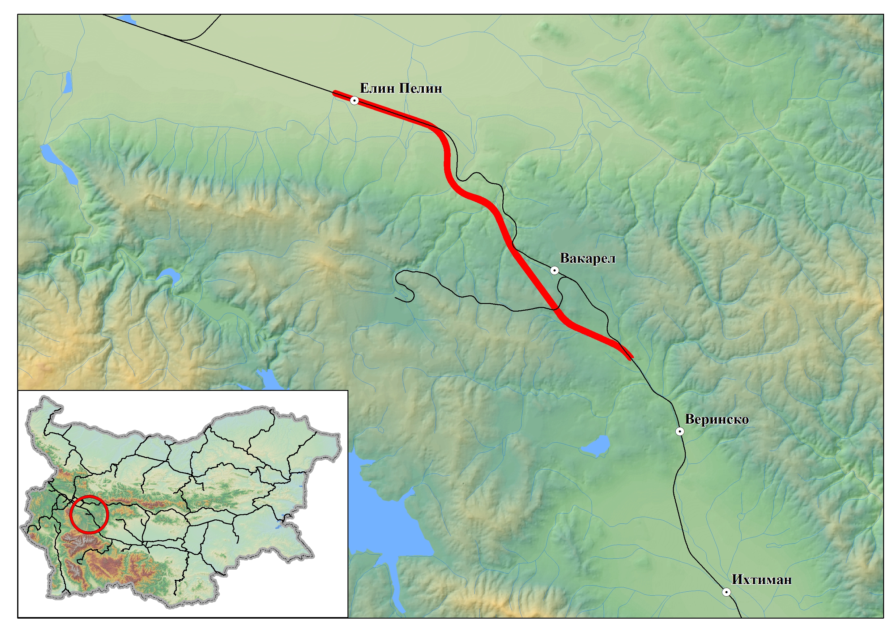 Участъкът между Елин Пелин и Вакарел е най-тежкият и труден за изпълнение от цялото трасе между София и Пловдив. Неговата дължина е приблизително 20 км и в обхвата му попада най-големият жп тунел в България, с дължина 6.8 км, който ще бъде построен по тунелен способ и ще бъде напълно съвместим с изискванията за оперативна съвместимост. Подобно съоръжение не е строено у нас от 50-те години на XX век, когато в периода 1949-1951 г. е построен тунел Козница, свързващ Стара планина и Същинска Средна гора.